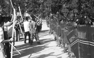 短時間內,由一百多名該分區人武部“處突”官兵、應急分隊民兵組織“突擊分隊”全副武裝集合完畢。然后,他們分乘3輛大卡車快速向目標地域開進。