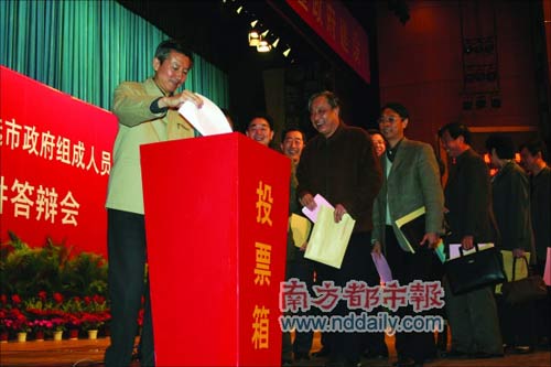 2月26日,南京舉行全市干部大會,與會者包括南京市四套班子領導成員、出席過黨的十七大和江蘇省十一次黨代會的代表等,共300多人。會上,人手一張選票,選票上有51個“填空題”:填寫51個部門區縣一把手的推薦人選,其中包括南京市政府47名組成人員人選和4位區(縣)委書記人選。
