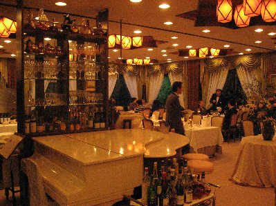 在小坂哲瑯的帶領下,記者來到將在6日晚間招待胡錦濤主席用餐的三樓宴會廳。大廳入口處擺放著一架白色三角鋼琴,左側的玻璃架里有各色葡萄酒供賓客享用。鋪著淡色桌布的餐桌上擺著鮮花和精致的法式餐具。在悠揚的長笛曲中,宴會廳的氛圍顯得格外寧謐優雅。記者注意到,這里的侍應生大多較為年長,他們身穿西裝套服,彬彬有禮,風度不凡。
