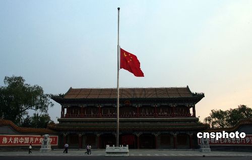 19日4時58分,天安門廣場下半旗為四川汶川大地震遇難同胞志哀。