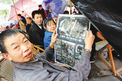 綿陽安縣人民公園安置點,為災區群眾提供了最新的報紙。(王科/攝)
