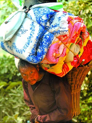 昨日,一名災(zāi)民背著搶救出來的家什,從南壩撤離。