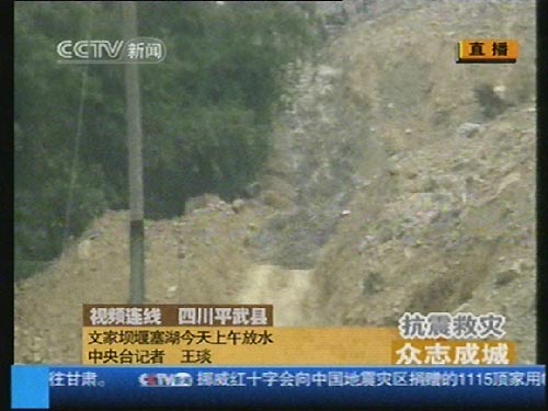 中新網5月27日電 今日上午10時30分許,四川地震災區平武縣文家壩堰塞湖放水泄洪。