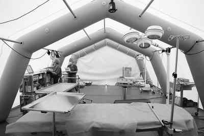 醫院設立了門診、內科、外科、婦科、兒科和藥房,還有放射科、檢驗科、病房以及重癥監護室,可謂“麻雀雖小,五臟俱全”。我們來到作為手術室的帳篷前,這頂帳篷不僅大而且顯得安全、結實,帳篷用充氣管支撐起來,里面有散熱的空調設備。據介紹,野戰醫院每頂帳篷都由天然材料制成,防火、無污染,還有真空隔熱層。配備的制氧機可直接將空氣變成氧氣,并可以調節氧氣濃度,從而代替了笨重的氧氣瓶。帳篷里面,整齊的擺放著手術服和拖鞋,一個洗手池已經固定好。27日,這里就做了一臺簡單的手術。