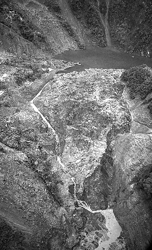 俯拍的唐家山堰塞湖泄流情景。昨日7時,唐家山堰塞湖開始泄流。楊衛華 攝