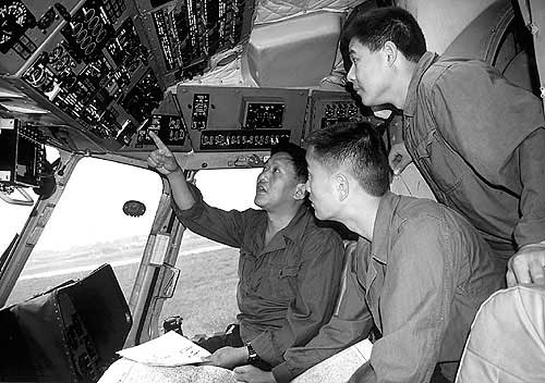 2004年,邱光華(左)在成都某機場向年輕飛行員傳授飛行技巧。黃鵬攝