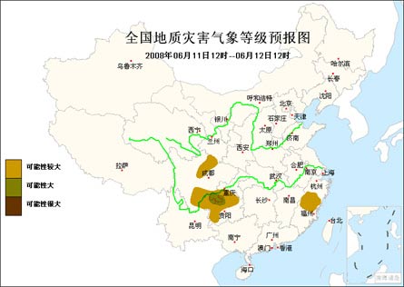 中新網6月11日電 據問天網消息,國土資源部、中國氣象局今天上午11時聯合發布地質災害氣象預報: