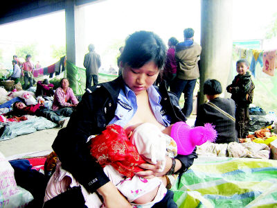 地震發(fā)生后,被轉(zhuǎn)移來(lái)的嬰兒除了可以喝一點(diǎn)水和稀飯外,沒(méi)有其他東西可吃。“大人還可以餓、還可以忍,而這些小嬰兒卻不能餓、不能忍!作為母親,我覺(jué)得這些孩子太可憐了。正好我還在哺乳期,就讓我來(lái)給他們喂奶吧!”在受災(zāi)群眾安置點(diǎn)協(xié)助工作的29歲民警蔣曉娟提出:我去給這些嬰兒哺乳!