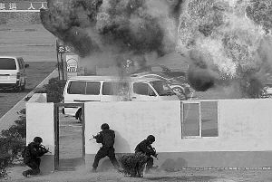 在指揮員下達(dá)攻擊令的余音聲中,突擊分隊(duì)兵分5路向目標(biāo)發(fā)起攻擊:從地下鉆出的特戰(zhàn)隊(duì)員,對(duì)大廳兩名歹徒實(shí)施了無(wú)聲射殺,迅速排除了出入口爆炸物,為救援行動(dòng)打開(kāi)了通道?罩写菇档奶貞(zhàn)隊(duì)員從天窗潛入“歹徒”所在的樓層,乘坐攀登突擊車的兩組隊(duì)員左右破窗,與空中垂降的戰(zhàn)友同時(shí)攻入大廳,“歹徒”未及反抗,就被一一擊斃或制服。樓頂?shù)奶貞?zhàn)隊(duì)員在對(duì)防護(hù)窗實(shí)施精確爆破后,利用繩索從天而降,破窗而入,身體騰空中,舉槍擊發(fā),“歹徒”未及反應(yīng),就已中彈斃命,人質(zhì)被安全解救。