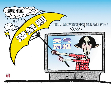 “潛規(guī)則”比“報不準”更可恨,為了百姓的利益,為了自身的價值,請收起“潛規(guī)則”,大膽、明朗地預報天氣情況,即使出現(xiàn)差錯,相信公眾也能原諒你們的。(成彪 王成喜)