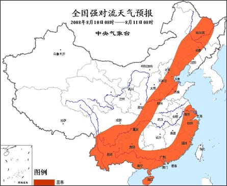 中新網8月10日電 據問天網消息:中央氣象臺8月10日06時繼續發布強對流天氣預報:預計今天白天到夜間,陜西東南部、內蒙古東部偏南地區、華北東部和南部、東北地區中西部、湖北西部、黃淮西北部、江南東部、華南大部、西南地區東部等地的部分地區將有雷電天氣,上述局地并有雷雨大風等強對流天氣。
