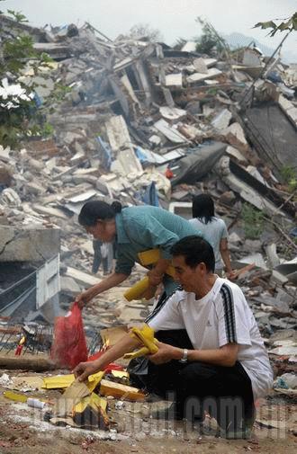 坐在老縣城畜牧局宿舍樓下,46歲的陳幫金無言地看著幫工扎紙人。這里,曾經充滿了他和妻子的歡笑。但地震那天,44歲的妻子在新縣城天然氣公司附近遇難,按照當地風俗,陳幫金要等紙人扎好后,和兒媳、弟妹一起,翻過廢墟到妻子遇難的地方祭拜。此景悲涼,陳幫金一家仍充滿了感激:“全靠政府政策好,從13日起就開禁了,不然我們都不曉得什么時候才能回來拜一下。”