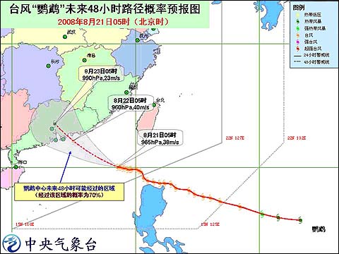 受其影響,今天白天到夜間,巴士海峽、巴林塘海峽、南海中北部海面、臺灣海峽南部海面、臺灣省南部沿海、廣東中東部沿海以及福建南部沿海將有7-9級大風,“鸚鵡”中心經過的附近海面風力可達10-13級;臺灣南部、廣東中東部沿海、福建東南部沿海將有大到暴雨,其中廣東東部沿海的局部地區有大暴雨。