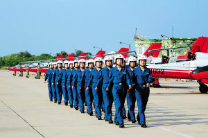 銀白色頭盔,天藍(lán)色飛行服,在紅白相間的戰(zhàn)鷹映襯下,整裝待發(fā)的女飛行學(xué)員顯得英姿颯爽。“開車!”隨著指揮員、飛行大隊長孫光輝一聲令下,剎那間,發(fā)動機轟鳴震天撼地,戰(zhàn)鷹依次滑進(jìn)跑道,以雷霆萬鈞之勢直沖云天。