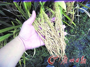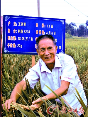 該鄉農技站長鄒都樂介紹說,王洪青種的這種水稻是袁隆平院士新研制的品種“科超3218”,前幾天經專家田間現場測產,每畝有效穗超過18萬支,平均每穗實粒207粒,按每千粒27克計算,預計今年畝產達到1008公斤!叭绮怀鲆馔,今年牛形嘴村這塊102畝的試驗田,平均畝產將鐵定突破900公斤!编u都樂說,村里去年就開始種上袁院士的這種超級稻,去年8月份,眼看長勢喜人的水稻即將割鐮,可惜突然來了一場“圣帕臺風”,一夜之間將水稻刮倒許多。最后收割時一測算,畝產只有870公斤!叭绻麤]有那場臺風,畝產900公斤的目標去年早就提前實現了!”