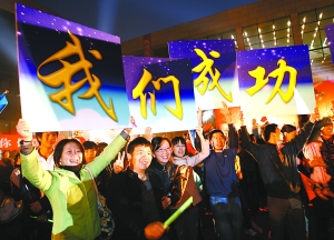 昨日,北京航天城,航天員家屬慶祝神七成功返航。記者 張濤 攝