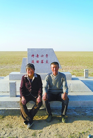 昨日,牧民賈四娃(右)夫婦坐在神六落地紀(jì)念碑前留影。