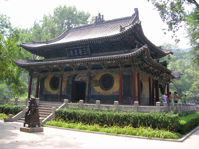 在中軸線末端,是宏偉壯麗的圣母殿。圣母殿背靠懸甕山,前臨魚沼,晉水的其他二泉——“難老”和“善利”分列左右。此殿創建于北宋天圣年間(公元1023——1032年),崇寧元年(公元1102年)重修,是現在晉祠內最為古老的建筑。殿高約十九米,重檐歇山頂,面寬七間,進深六間,平面布置幾乎成方形。殿身四周圍廊,前廊進深兩間,廊下寬敞。在我國古代建筑中,殿周圍廊,此為現存最早的一個實例。殿周柱子略向內傾,四根角柱顯著升高,使殿前檐曲線弧度很大。下翹的殿角與飛梁下折的兩翼相互映襯,一起一伏,一張一弛,更顯示出飛梁的巧妙和大殿的開闊。殿、橋、泉亭和魚沼,相互陪村,渾然一體。圣母殿采用“減柱法”營造,殿內外共減十六根柱子,以廊柱和檐柱承托殿頂屋架,因此,殿前廊和殿內十分的寬敞!皽p柱法”的熟練使用。說明宋代在建筑上已進一步掌握了力學原理;斗拱和柱高的比例適當,避免了隋唐建筑中用料的浪費,在建筑式樣上也更富于藝術性。我國的木結構建筑,經歷了一個由隋唐的雄壯堅實到明清的華麗輕巧的發展地程,而宋代建筑正是這個過程中的重要環節。圣母殿是宋代建筑的代表作,對于研究我國宋代建筑和我國建筑發展史都很有價值。殿內無柱,不但增加了高大神龕中圣母的威嚴,而且為設置塑像提供了很好的條件。殿內共四十三尊泥塑彩繪人像,除龕內二小像系后補外,其余多北宋代原塑。主像圣母,即唐叔虞和周成王的母親,周武王的妻子,姜子牙的女兒——邑姜,其塑像設在大殿正中的神龕內。其余四十二尊侍從像對稱地分列于龕外兩側。其中宦官像五尊,著男服的女官像四尊,侍女像共三十三尊。圣母邑姜,曲膝盤坐在飾鳳頭的木靠椅上,鳳冠蟒袍,霞帔珠瓔,面目端莊,顯示了統治者的尊貴和奢華。四十二個侍從像,手中各有所奉,為帝后服種種勞役,例如侍奉文印翰墨,灑掃梳妝,奉飲食,侍起居以至奏樂歌舞等等。這些塑像造型生動,姿態自然,尤其是侍女像更是精品。宋代的藝人,滿懷同情,塑造了一群終生被幽禁深宮,失去了自由,埋葬了青春的女性。這些侍女像的肢體身材比較造度,服飾美觀大方,衣紋明快流暢。她們的年齡或任或少,身段或豐滿或苗條,面龐或圓潤或清秀,神態或幽怨或天真,一個個性格鮮明,表情自然,加之高度與真人相仿,更顯得栩栩如生。這組塑像突破了神廟建筑中以塑造神佛為主的老套,真實地表現了被禁錮深宮受盡役使的侍從們的生活精神面貌,從而反映了封建社會中的一個側面。在技巧上,顯然相當準確地掌握了人體的比例和解剖關系,手法純熟,有高度的藝術表現力。它們是我國古代雕塑藝術中的珍品,在美術史上占有重要的位位。人們談到晉祠,往往總要談到這些精彩的宋塑。