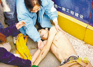 潘興聽到楊森喊,隨即看到林松嶺赤著上身很快跑過去,后面幾人在追。潘興回憶,當天林松嶺穿著一件黑色的小風衣,“外套是他自己脫掉的,但襯衫怎么沒有了我不知道。”潘興追出去幾十米后,看到林躺在地上,身體蜷曲著。“我扒開正在打松嶺的人說別打了,后面就有人抓住我的頭發把我摁住,不知道有幾個人照著我的頭不停地踢。”