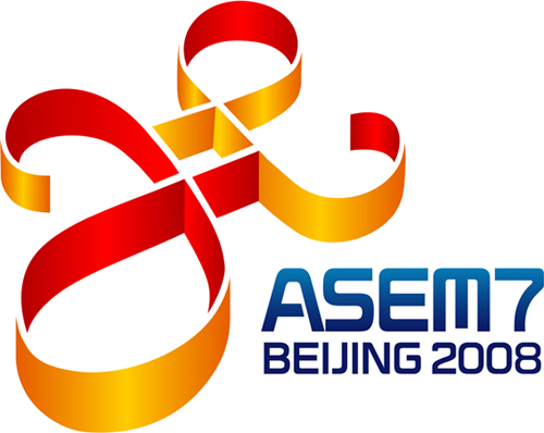 第七屆亞歐首腦會(huì)議會(huì)標(biāo)造型創(chuàng)意來(lái)源于中國(guó)結(jié),寓含了亞歐合作與和諧的精神。會(huì)標(biāo)圖案中字符a和e分別是亞洲和歐洲的英文單詞首字母,字符e的金色部分構(gòu)成漢字"七",表示會(huì)議屆次。會(huì)標(biāo)文字部分中ASEM為亞歐會(huì)議英文縮寫(xiě),數(shù)字“7”亦代表會(huì)議屆次,BEIJING 2008表示會(huì)議舉辦地點(diǎn)和時(shí)間。