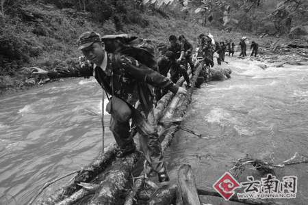 小心翼翼通過用樹木搭的橋