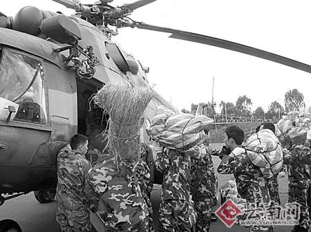 由于受災較嚴重的地區均屬于偏遠高寒山區,通往災區的道路全部中斷,短期之內無法搶通,為及時將災區急需的大量救援物資送達災區,楚雄彝族自治州請求省人民政府給予協調直升飛機支援災區救援。省人民政府接到請求后,協調由成都軍區的3架直升機參加支援楚雄州重災區應急救災工作。