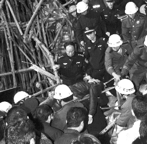 晚上8點多,搜救人員終于確定了被埋者的位置,但由于腳手架之間全是土,加上腳手架大都嚴重變形,給救援帶來了很大不便。