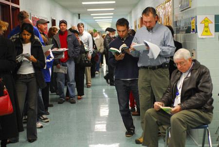 等到孩子們真正長大可以投票的時候,他們在熱情高漲的同時又不乏理性。在呂芳的想像中,投票站應(yīng)該是兩方對壘,支持者搖旗吶喊才對。結(jié)果卻完全出乎他的預(yù)料。大選當(dāng)天,呂芳所在小組參觀的第一個投票點在弗吉尼亞Falls Church縣的一個社區(qū)活動中心。他們到那里時剛過6點,投票點外已經(jīng)排起了長龍,蜿蜒足有一二百米。人群中,有人帶著蹣跚學(xué)步的孩子,有人坐著輪椅,有人自己帶著椅子……“但是,整個人群靜悄悄的,沒有一點激動人心的表現(xiàn)。”