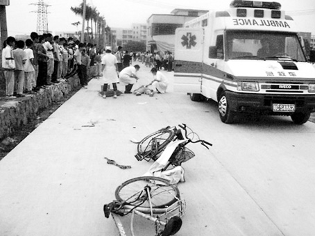 而此時,駱某正駕駛著泥頭車(當地拉渣土的一種貨車)經城東歧江路開往城東中學,在歧江路的拐彎處撞倒了3名學生和1名群眾。正在城東中學北門(后門)值班的綜治員黃積強和張耀毫發現后,一人邊大喊讓剛放學的學生們躲避,邊用對講機向白蕉鎮派出所報告,另一人則追趕泥頭車喝令其停下。