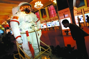 昨日,軍博展廳,觀眾在看“神七”艙外航天服。 記者 浦峰 攝