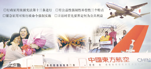 記者在采訪中了解到,我國目前沒有對行政征用進行專門的立法,行政征用除了有憲法的依據外,還散見于其他法律法規之中,如涉及消防、抗洪、抗震等。但針對征用機場、客機的具體規定,還是空白。