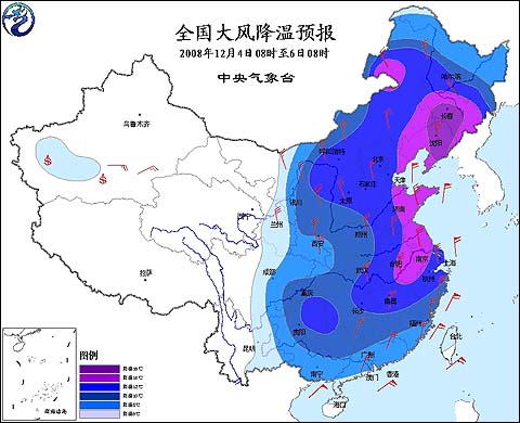 中央氣象臺2008年12月4日06時繼續發布寒潮橙色警報: