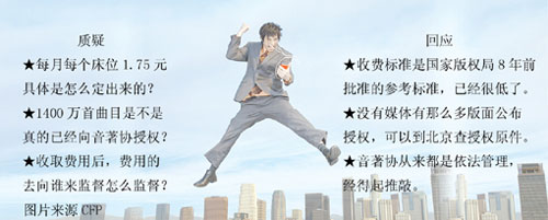 昆明市飯店與餐飲行業協會秘書長楊艾軍說,對于音著協宣稱的征收背景音樂費的目的和意義,他們是支持與理解的,但昆明酒店企業無法承擔這樣的經濟壓力。昆明飯店集體停播背景音樂后,曾向音著協云南辦事處提出了二十余條的質疑,后來雖然有些答復,但都是避重就輕,對核心問題并沒有給予明確的回應。