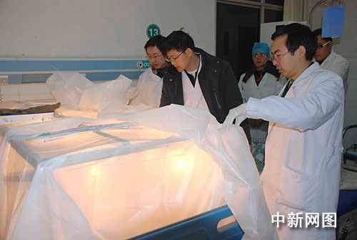 圖為第三軍醫(yī)大學重慶西南醫(yī)院燒傷專家26日晚在城口縣人民醫(yī)院查看噴爐事故傷者情況。作者:樊官勇