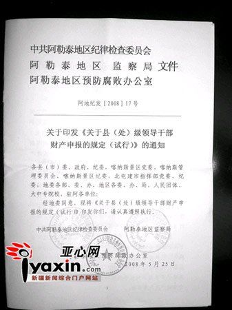 新年第一天,新疆阿勒泰地區的廉政網上,首批公布了55名新提拔正科和副縣級干部的財產申報資料。同一天,該地區啟動了縣(處)級領導干部的首次財產申報工作。