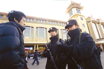 北京女特警首次亮相春運 與男特警搭檔執勤(圖)