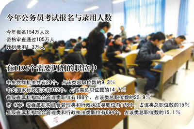 在7555個職位中,共有1196個職位沒有合格人選,或者合格人選未達到規(guī)定面試比例,其中有586個職位報考人數(shù)本身就未達到規(guī)定的面試比例,甚至無人報考。主管部門分析發(fā)現(xiàn),這些職位主要是艱苦、邊遠、基層職位和專業(yè)特殊的職位,也有部分職位是由于設(shè)置不合理的資格條件,導致報考人員和過線人員較少。