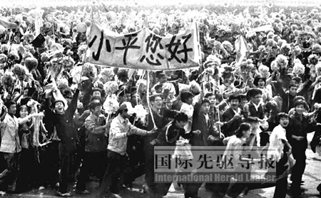 不遠(yuǎn)處,坐在木頭臨時搭建的臺子上,3000名日本青年也看得目瞪口呆,他們和中國觀眾一起歡呼著,跳躍著,沒有人愿意離開位置半步,生怕錯過任何一個歷史鏡頭。突然,在群眾方隊中,幾名北大生物系學(xué)生拉出了一條由床單做成的橫幅,綠色大紙上寫著:“小平您好!”四個大字。這是一個未經(jīng)審定的標(biāo)語,幾名便衣準(zhǔn)備上前搶奪,但還沒來得及行動,全場已經(jīng)沸騰了起來。
