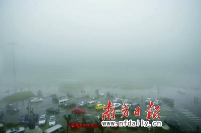 昨日下午2時30分,京珠北高速路已是一片霧茫茫,許多車輛為安全躲進服務區。  張由瓊攝