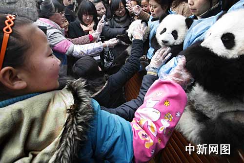 當(dāng)工作人員抱著只有半歲大的三只大熊貓寶寶走出熊貓?zhí)?yáng)產(chǎn)房時(shí),孩子們都戴上了專用的塑料手套,爭(zhēng)先恐后上前撫摸熊貓寶寶。說(shuō)起第一次親密接觸的感受,孩子們打了一個(gè)很形象的比喻:“摸上去就像摸柔軟的羽絨服一樣,很舒服。”