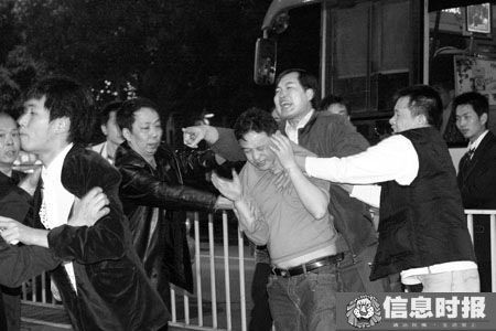 在現(xiàn)場(chǎng),記者看到該名穿淺紅色衣服的男子在不停打電話(huà),該名男子身高大概1米65左右,情緒暴躁,揮舞手臂。在接受警方調(diào)查時(shí),該名男子忽然一拳將旁邊面包車(chē)司機(jī)的兒子陳家文打倒在地。隨后還推開(kāi)前來(lái)執(zhí)勤的交警。“你們?nèi)?wèn)問(wèn),知不知道我是誰(shuí)?”該名男子向人群叫囂,現(xiàn)場(chǎng)一片混亂。 (信息時(shí)報(bào))