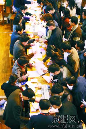 今天上午,節(jié)后首場綜合招聘會在(北京)農(nóng)展館舉行,人潮涌動的熱烈場面再次凸顯了2009年嚴(yán)峻的就業(yè)形勢。再過幾天,北京市及中央國家機關(guān)公務(wù)員招考也將陸續(xù)進入面試階段。