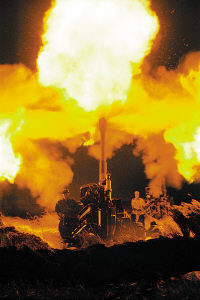 該師火炮群向“敵”陣地實施打擊。蘭訓攝