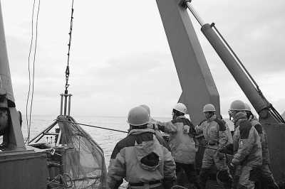 圖為南極考察隊隊員和雪龍船船員合力將萬米絞車上的多管采集器收回。