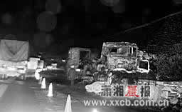 昨晚9時(shí)50分,記者乘坐的采訪車終于抵達(dá)車禍現(xiàn)場(chǎng)。交警用警示標(biāo)志攔出一段約200米遠(yuǎn)的警示帶,只留下一個(gè)車道供車輛通行。不遠(yuǎn)處,3臺(tái)被燒壞的貨車擺在公路一側(cè),一臺(tái)貨車上的棉布已經(jīng)燒毀,3臺(tái)車嚴(yán)重受損。現(xiàn)場(chǎng)有兩名交警維持秩序,其他受損車輛和死傷病員已轉(zhuǎn)離現(xiàn)場(chǎng)。