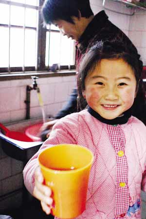 圖:終于有水了,一名小女孩端著剛接的自來水欣喜不已。 李根 小川 攝
