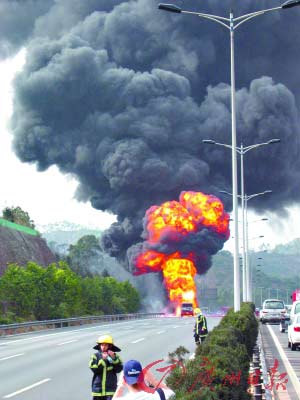 昨日下午4時20分,記者在莞深高速塘廈出入口看到,車龍排起有400米長,往東莞去的道路已經封閉,記者步行4公里趕到事發現場。起火的油罐車在東莞往深圳方向的車道,熊熊燃燒的火苗躥到20米高,濃煙翻滾,人在200米外就能感覺到灼痛。