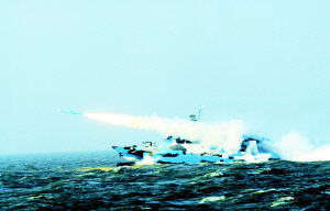 “嗖”的一聲巨響,艦艇輕微地抖動,官兵們心里“噔噔”直跳。導(dǎo)彈拖著長長的尾焰向遠(yuǎn)海飛去。首發(fā)命中!