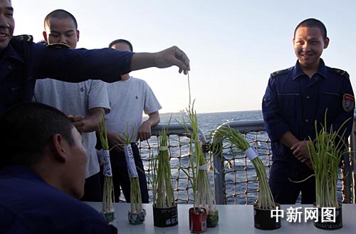 比一比,看看誰養的蒜苗長得高。中新社記者 孫自法 攝