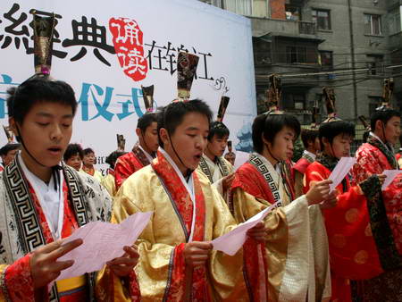 “龍之傳人,天命東方。列祖賜我光榮,蒼天降我大貴。弱冠既加,如之棟梁。道義不辭,大任始承……”3月26日,十八名身穿漢服的成都青年當眾完成漢代成人禮,而錦江區(qū)國學經(jīng)典誦讀活動亦隨即啟動。四川新聞網(wǎng)記者獲悉,為倡導轄區(qū)內(nèi)機關(guān)干部爭讀國學,錦江區(qū)公開發(fā)出倡議,號召全區(qū)機關(guān)干部每天關(guān)閉電視或電腦一小時,把時間用于學習國學經(jīng)典。